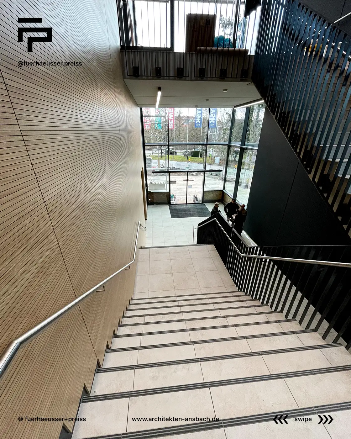 Zusätzlich wurden zwei neue Treppenhäuser und eine Verbindungsbrücke zur nebenan gelegenen Hochschule errichtet.